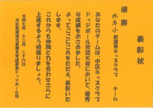 ご報告が遅れましたが、年末に参加した中区キッズクラブドッジボール交流会において、北方小キッズはなんと、優勝を勝ち取ることができました!今年はますますの活躍が期待されます。