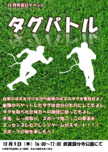 10月になり外で遊ぶのが心地よい季節になりましたね。スポーツの秋ということで今月の外遊びイベントでは、「タグバトル」を開催します!