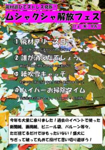 イベントで使った古新聞や画用紙などを使って新聞紙遊びや紙吹雪作りをします!日頃のムシャクシャを解放すべく、丸めて破いてちぎって盛大に遊びましょう!